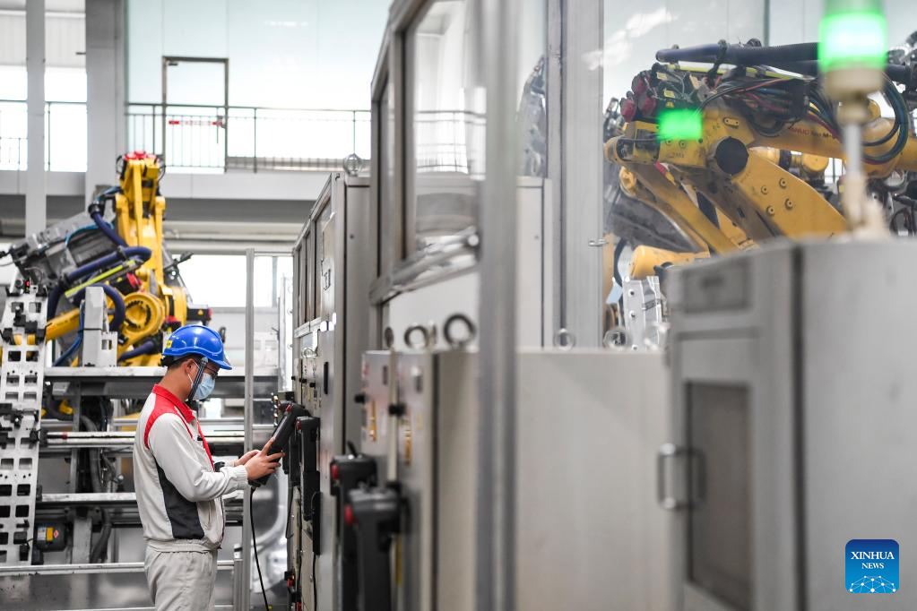 A worker works at an intelligent production base of the Great Wall Motors (GWM) in Yongchuan District of Chongqing, southwest China, Sept. 22, 2022. In recent years, Yongchuan District of Chongqing has focused on the development of smart manufacturing which features integrated industrial Internet, big data, artificial intelligence. Smart manufacturing has now become a new growth driver for the local economy. (Xinhua/Wang Quanchao)