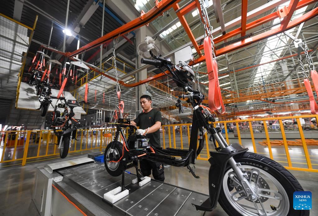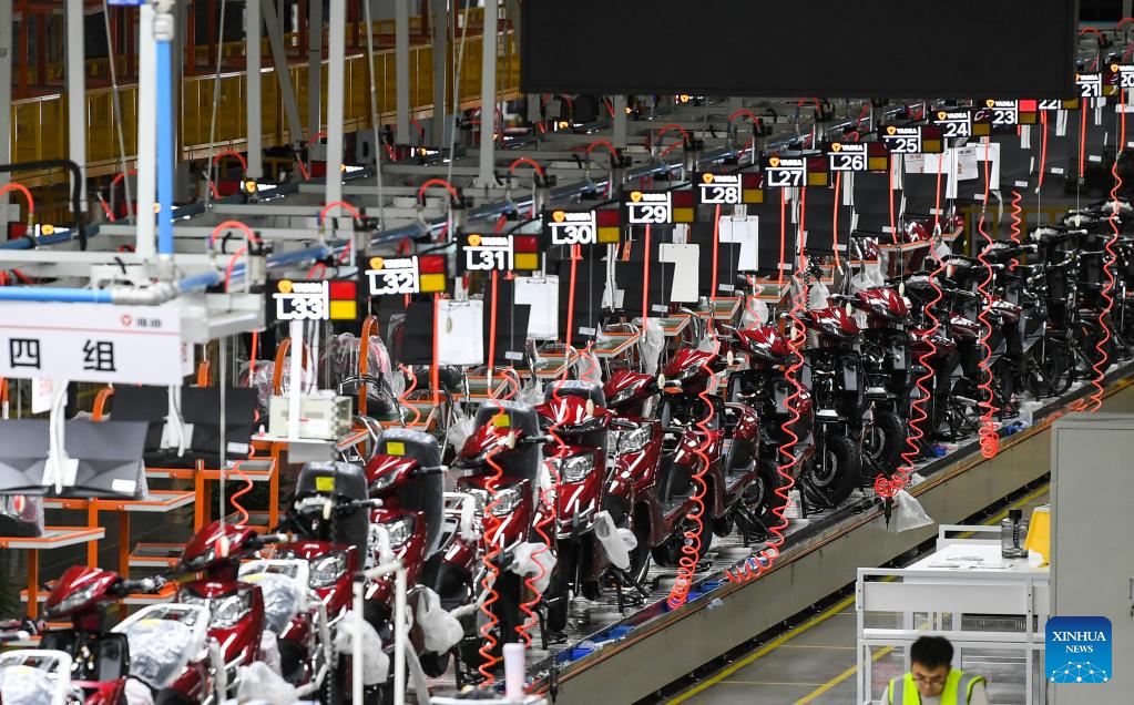 Photo taken on Sept. 22, 2022 shows Yadea Group's intelligent production base of electric scooters in Yongchuan District of Chongqing, southwest China. In recent years, Yongchuan District of Chongqing has focused on the development of smart manufacturing which features integrated industrial Internet, big data, artificial intelligence. Smart manufacturing has now become a new growth driver for the local economy. (Xinhua/Wang Quanchao)