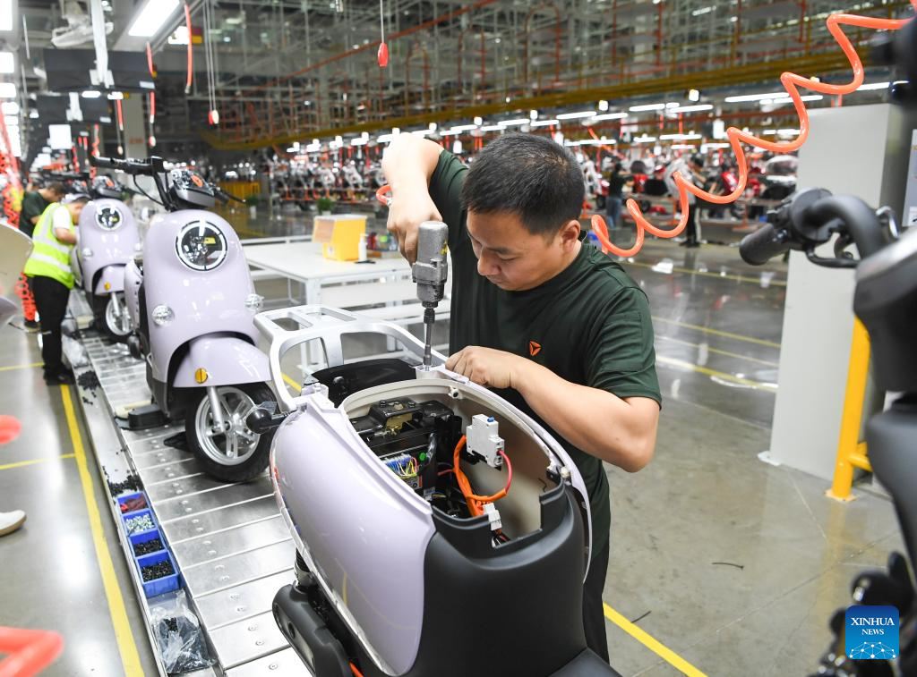 Workers work at Yadea Group's intelligent production base of electric scooters in Yongchuan District of southwest China's Chongqing, Sept. 22, 2022. In recent years, Yongchuan District of Chongqing has focused on the development of smart manufacturing which features integrated industrial Internet, big data, artificial intelligence. Smart manufacturing has now become a new growth driver for the local economy. (Xinhua/Wang Quanchao)