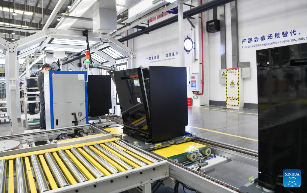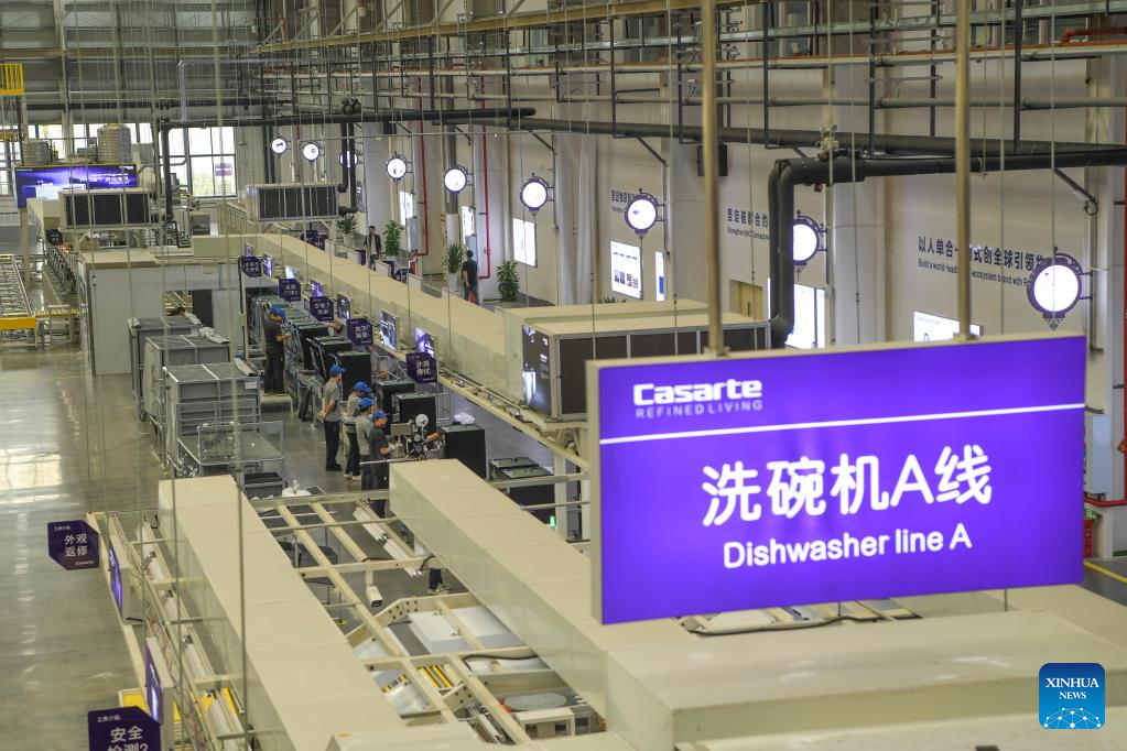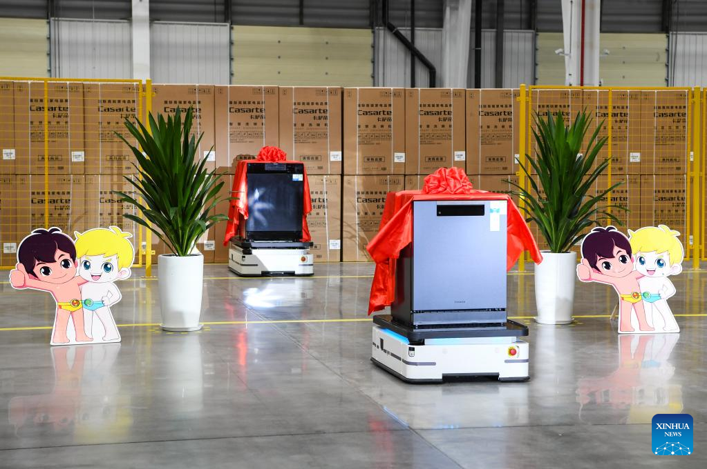 Photo taken on Sept. 25, 2022 shows finished dishwasher products displayed during an off-line ceremony of a dishwasher interconnected factory of Chongqing Haier Washing Electric Appliances Co.LTD in southwest China's Chongqing. A dishwasher interconnected factory of Chongqing Haier Washing Electric Appliances Co.LTD was officially put into production here at Gangcheng Industry Park in Jiangbei District of Chongqing on Sunday. This 42,000-square-meter factory, with a designed annual output of one million dishwashers, will utilize advanced technologies like 5G and Industrial Internet towards the digitization and intelligentization of dishwasher production. (Xinhua/Wang Quanchao)