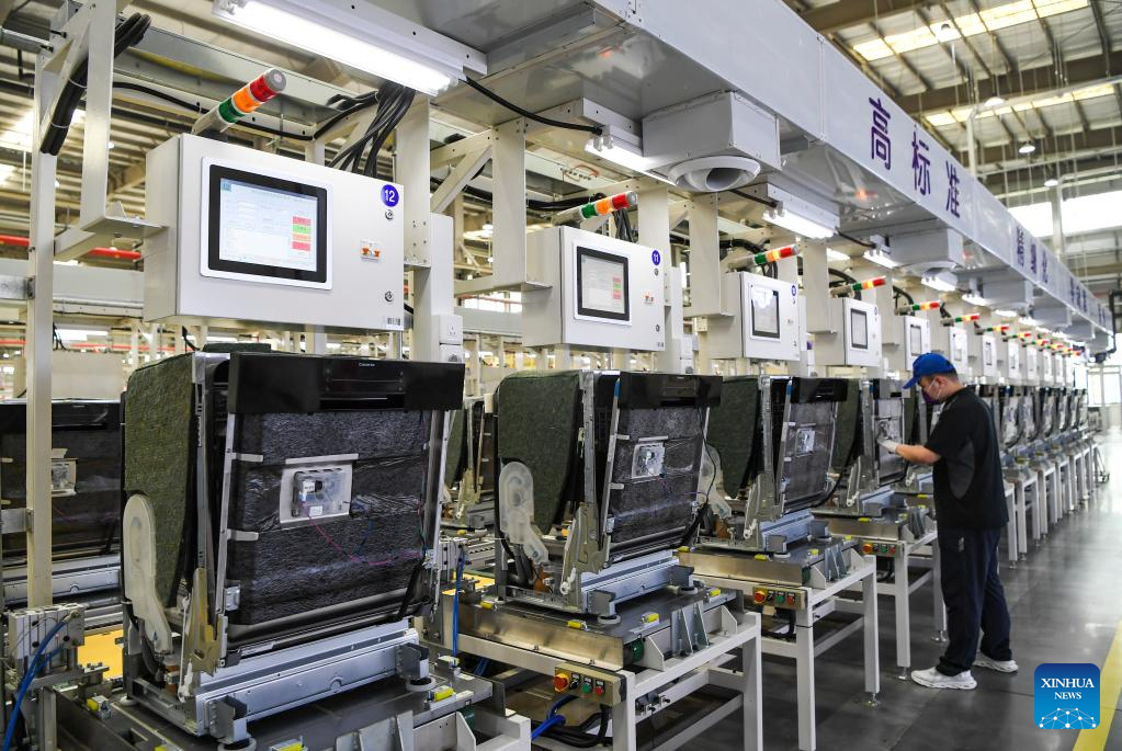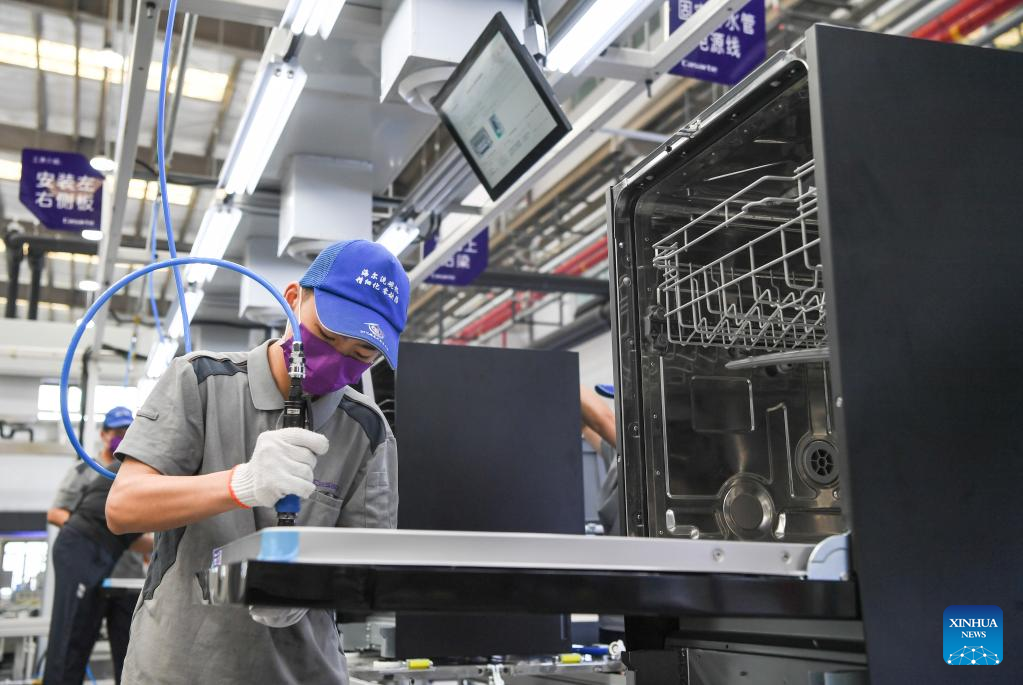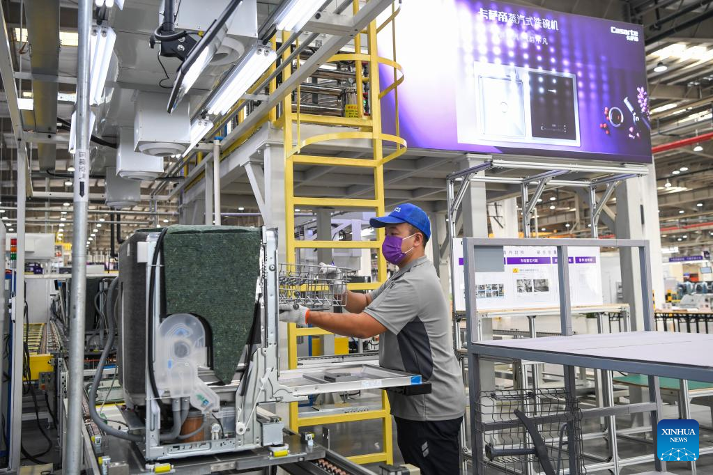 A worker is seen at the production line of a dishwasher interconnected factory of Chongqing Haier Washing Electric Appliances Co.LTD in southwest China's Chongqing, Sept. 25, 2022. A dishwasher interconnected factory of Chongqing Haier Washing Electric Appliances Co.LTD was officially put into production here at Gangcheng Industry Park in Jiangbei District of Chongqing on Sunday. This 42,000-square-meter factory, with a designed annual output of one million dishwashers, will utilize advanced technologies like 5G and Industrial Internet towards the digitization and intelligentization of dishwasher production. (Xinhua/Wang Quanchao)