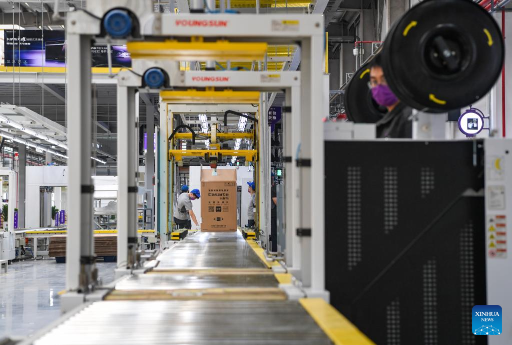 Photo taken on Sept. 25, 2022 shows the production line of a dishwasher interconnected factory of Chongqing Haier Washing Electric Appliances Co.LTD in southwest China's Chongqing. A dishwasher interconnected factory of Chongqing Haier Washing Electric Appliances Co.LTD was officially put into production here at Gangcheng Industry Park in Jiangbei District of Chongqing on Sunday. This 42,000-square-meter factory, with a designed annual output of one million dishwashers, will utilize advanced technologies like 5G and Industrial Internet towards the digitization and intelligentization of dishwasher production. (Xinhua/Wang Quanchao)