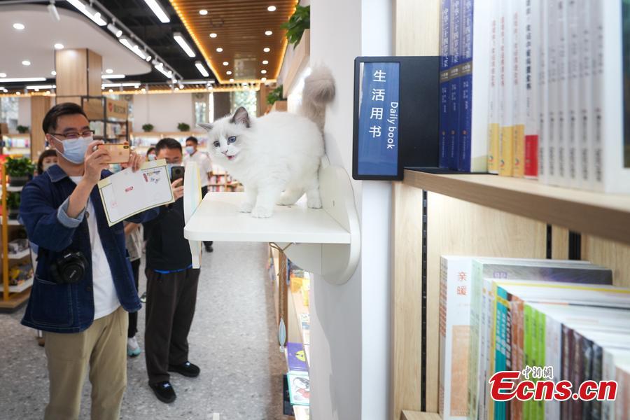 Visitors take photos of a cat in a pet-themed Xinhua Bookstore in Beijing on Sept. 25, 2022. Xinhua Bookstore unveiled its first pet-themed bookstore in Beijing on Sunday. (Photo: China News Service/Jia Tianyong)