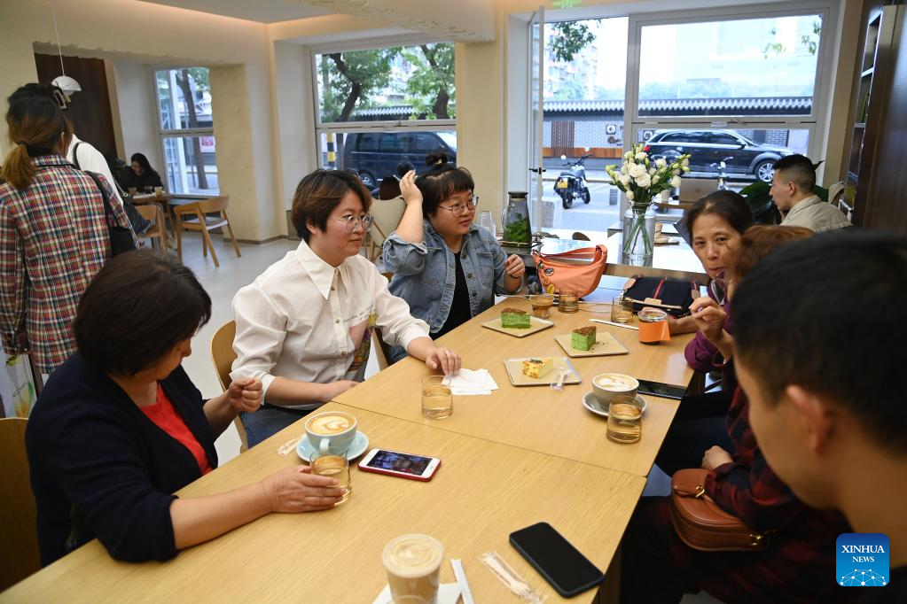 Chen Jiayue (2nd L), a hearing-impaired barista, communicates with family members of other hearing-impaired people at her own cafe in Xi'an, capital of northwest China's Shaanxi Province, Sept. 24, 2022. The International Day of the Deaf falls on the fourth Sunday each September. Since 2019, Shaanxi Urban Economy School has been providing free barista training for the hearing-impaired. Trainees can learn coffee-making skills as well as cafe operation knowledge during the training programme, which could help them in paving the way either to start their coffee business or get employed in this industry. So far, more than 20 people who have graduated from the training programme are working at cafes in various places across China. (Xinhua/Zheng Xin)