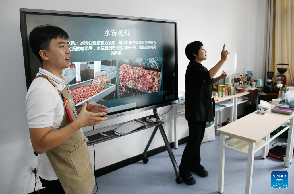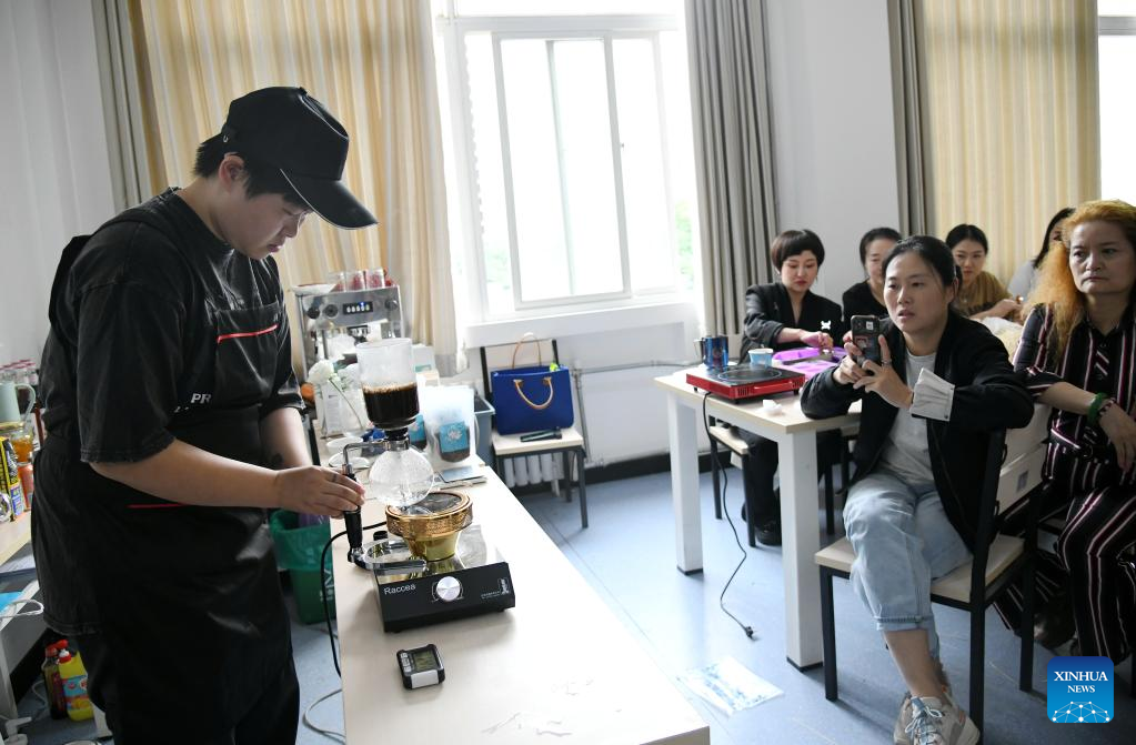 Hearing-impaired trainees attend a barista training class at Shaanxi Urban Economy School in Xi'an, capital of northwest China's Shaanxi Province, Sept. 22, 2022. The International Day of the Deaf falls on the fourth Sunday each September. Since 2019, Shaanxi Urban Economy School has been providing free barista training for the hearing-impaired. Trainees can learn coffee-making skills as well as cafe operation knowledge during the training programme, which could help them in paving the way either to start their coffee business or get employed in this industry. So far, more than 20 people who have graduated from the training programme are working at cafes in various places across China. (Xinhua/Zheng Xin)