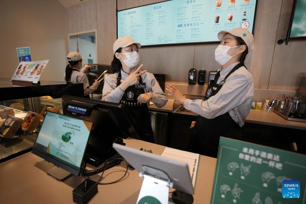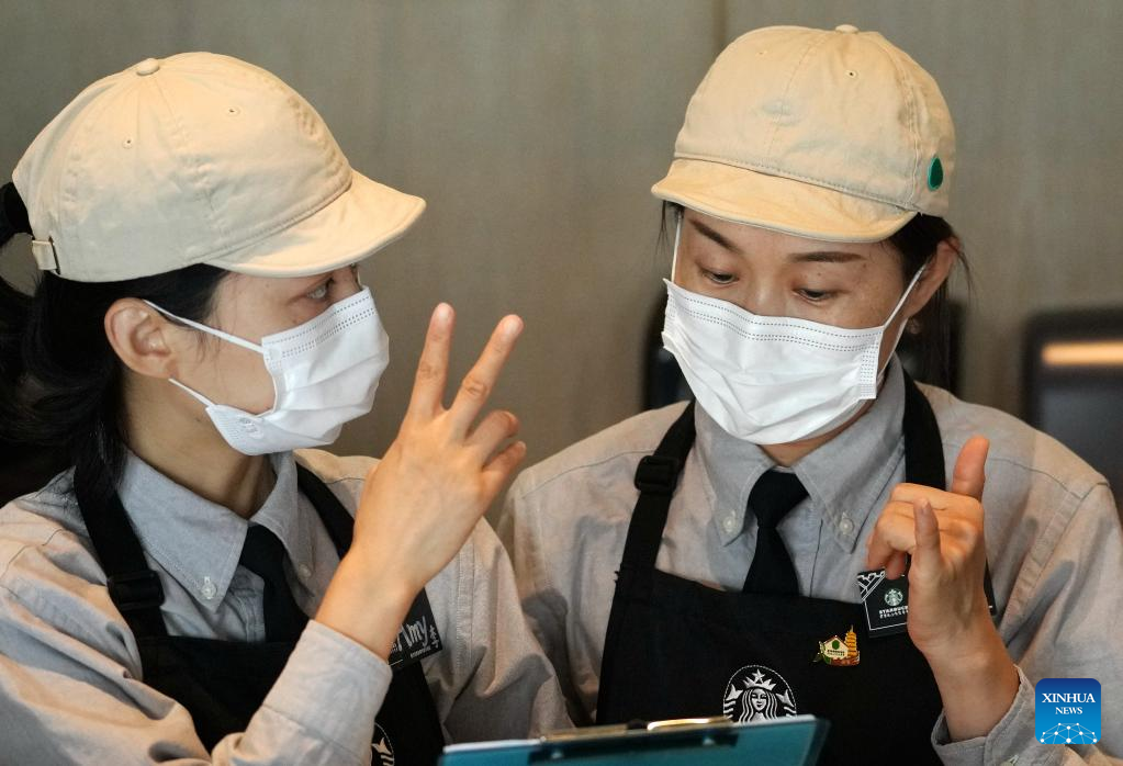 Wang Ru (R) and Li Sha, both hearing-impaired baristas, communicate through sign language at a sign language store of Starbucks in Xi'an, capital of northwest China's Shaanxi Province, July 4, 2022. The International Day of the Deaf falls on the fourth Sunday each September. Since 2019, Shaanxi Urban Economy School has been providing free barista training for the hearing-impaired. Trainees can learn coffee-making skills as well as cafe operation knowledge during the training programme, which could help them in paving the way either to start their coffee business or get employed in this industry. So far, more than 20 people who have graduated from the training programme are working at cafes in various places across China. (Xinhua/Li Yibo)