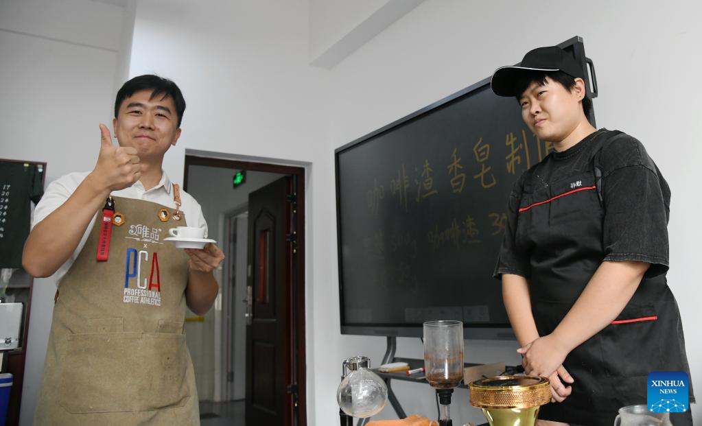 Training instructor Sun Yu (L) gives a thumb-up to the coffee made by hearing-impaired barista Zhou Jie during a barista training class at Shaanxi Urban Economy School in Xi'an, capital of northwest China's Shaanxi Province, Sept. 22, 2022. The International Day of the Deaf falls on the fourth Sunday each September. Since 2019, Shaanxi Urban Economy School has been providing free barista training for the hearing-impaired. Trainees can learn coffee-making skills as well as cafe operation knowledge during the training programme, which could help them in paving the way either to start their coffee business or get employed in this industry. So far, more than 20 people who have graduated from the training programme are working at cafes in various places across China. (Xinhua/Li Yibo)
