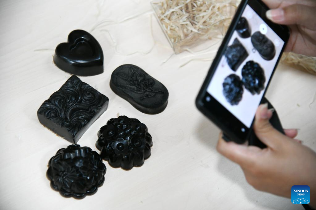 A trainee takes pictures of soaps made with coffee grounds at Shaanxi Urban Economy School in Xi'an, capital of northwest China's Shaanxi Province, Sept. 22, 2022. The International Day of the Deaf falls on the fourth Sunday each September. Since 2019, Shaanxi Urban Economy School has been providing free barista training for the hearing-impaired. Trainees can learn coffee-making skills as well as cafe operation knowledge during the training programme, which could help them in paving the way either to start their coffee business or get employed in this industry. So far, more than 20 people who have graduated from the training programme are working at cafes in various places across China. (Xinhua/Li Yibo)