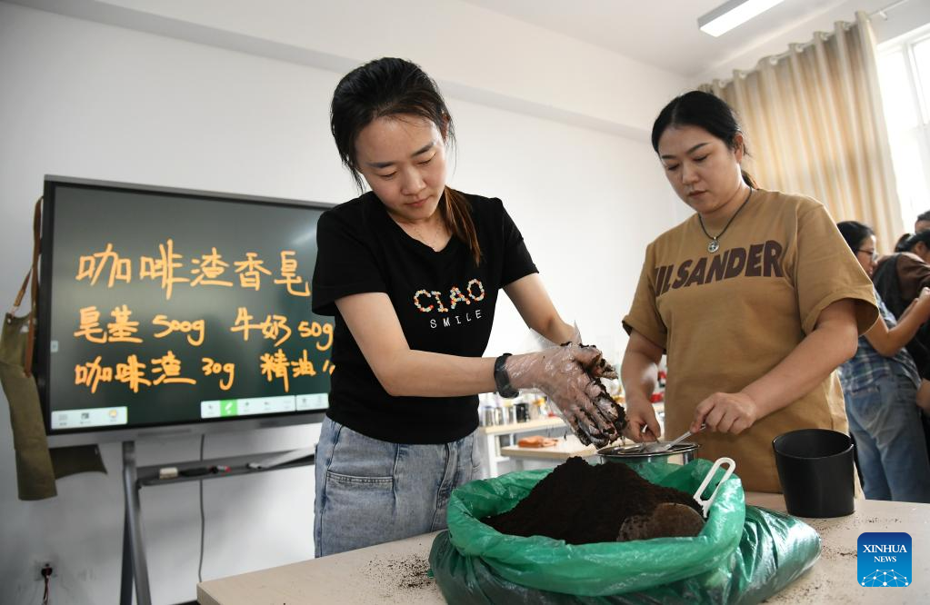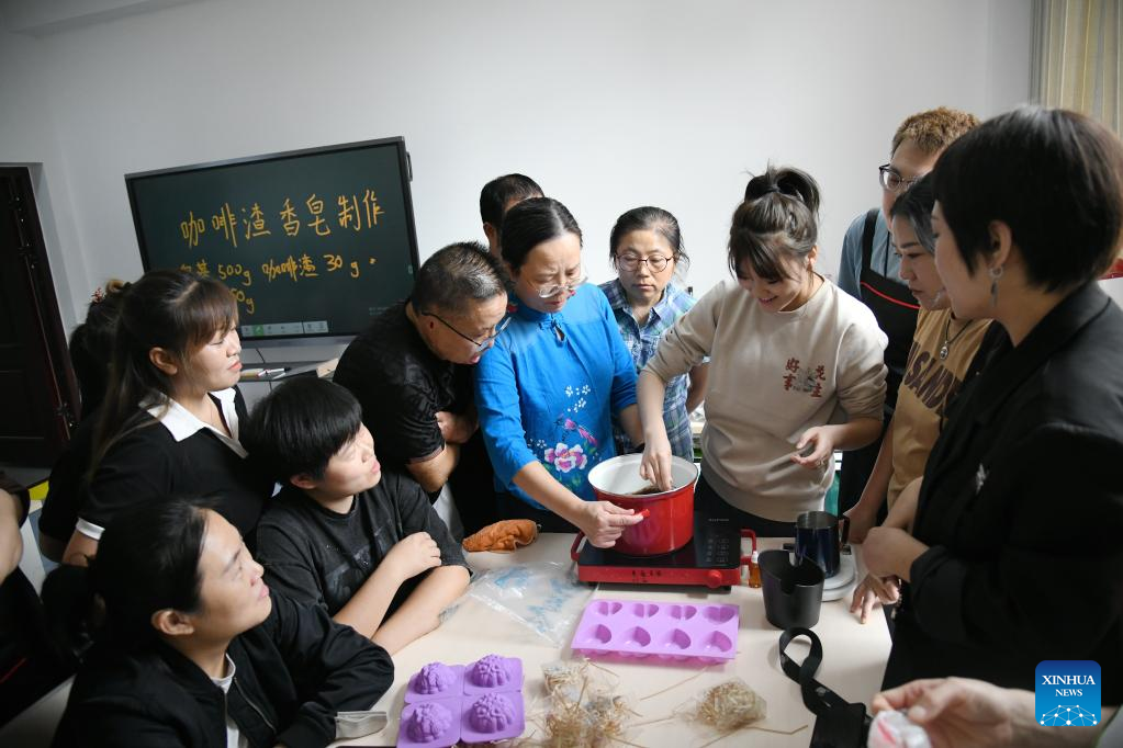 Trainees learn to make soaps with coffee grounds at Shaanxi Urban Economy School in Xi'an, capital of northwest China's Shaanxi Province, Sept. 22, 2022. The International Day of the Deaf falls on the fourth Sunday each September. Since 2019, Shaanxi Urban Economy School has been providing free barista training for the hearing-impaired. Trainees can learn coffee-making skills as well as cafe operation knowledge during the training programme, which could help them in paving the way either to start their coffee business or get employed in this industry. So far, more than 20 people who have graduated from the training programme are working at cafes in various places across China. (Xinhua/Li Yibo)