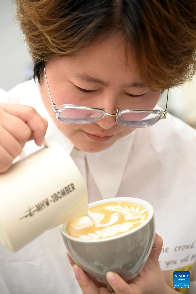 Chen Jiayue, a hearing-impaired barista, makes a cup of coffee at her own cafe in Xi'an, capital of northwest China's Shaanxi Province, Sept. 24, 2022. The International Day of the Deaf falls on the fourth Sunday each September. Since 2019, Shaanxi Urban Economy School has been providing free barista training for the hearing-impaired. Trainees can learn coffee-making skills as well as cafe operation knowledge during the training programme, which could help them in paving the way either to start their coffee business or get employed in this industry. So far, more than 20 people who have graduated from the training programme are working at cafes in various places across China. (Xinhua/Li Yibo)