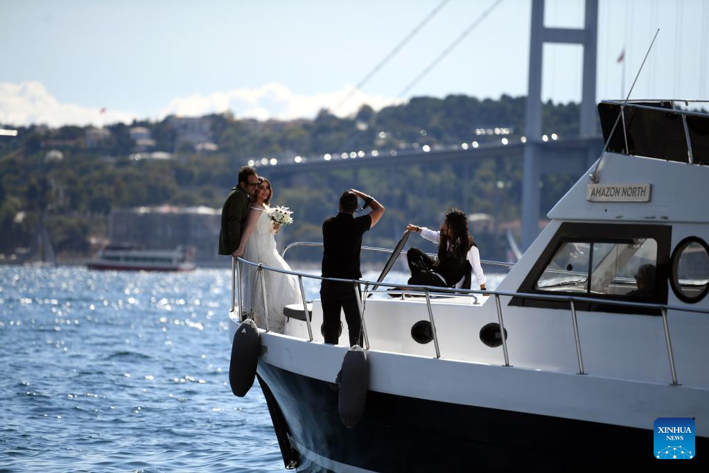A couple pose on a boat in Bosporus Strait in Istanbul, Trkiye, Sept. 24, 2022. (Xinhua/Shadati)