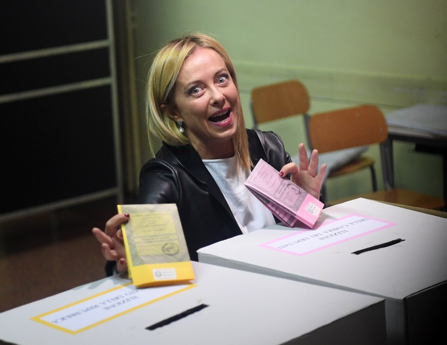 Giorgia Meloni, leader of the Brothers of Italy party, shows her ballots at a polling station in Rome, Italy, Sept. 25, 2022. (Xinhua/Jin Mamengni)