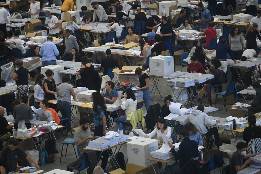 Staff members count ballots voted by Italian citizens living abroad in Bologna, Italy, Sept. 25, 2022. (Photo by Gianni Schicchi/Xinhua)