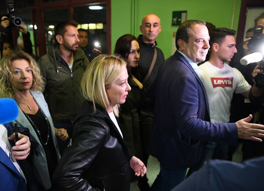 Giorgia Meloni (front, 2nd L), leader of the Brothers of Italy party, leaves after voting at a polling station in Rome, Italy, Sept. 25, 2022. (Xinhua/Jin Mamengni)