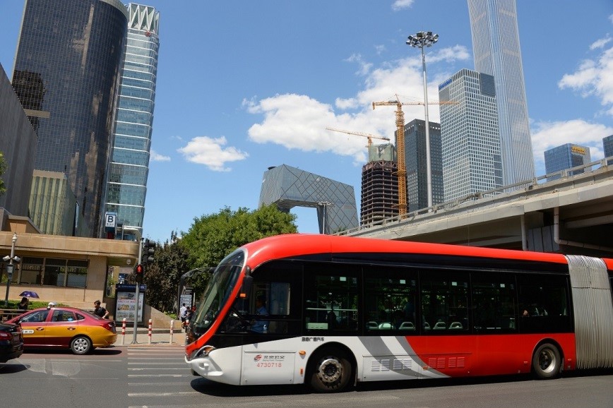 Photo shows a pure electric bus in Beijing. Compared with traditional fuel-powered buses, electric buses come with less noise and are equipped with air purifiers and 360-degree surround-view cameras. (People's Daily Online/Hu Qingming)