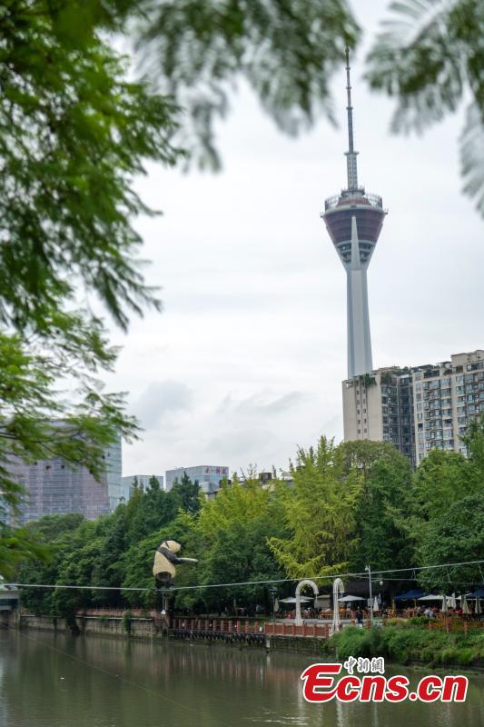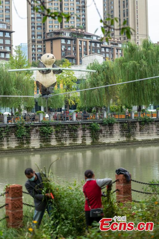 A bamboo-woven giant panda stands on a tightrope across Fuhe River in Chengdu, southwest China's Sichuan Province, adding fun to the city, Sept. 27, 2022. (Photo: China News Service/Liu Zhongjun)