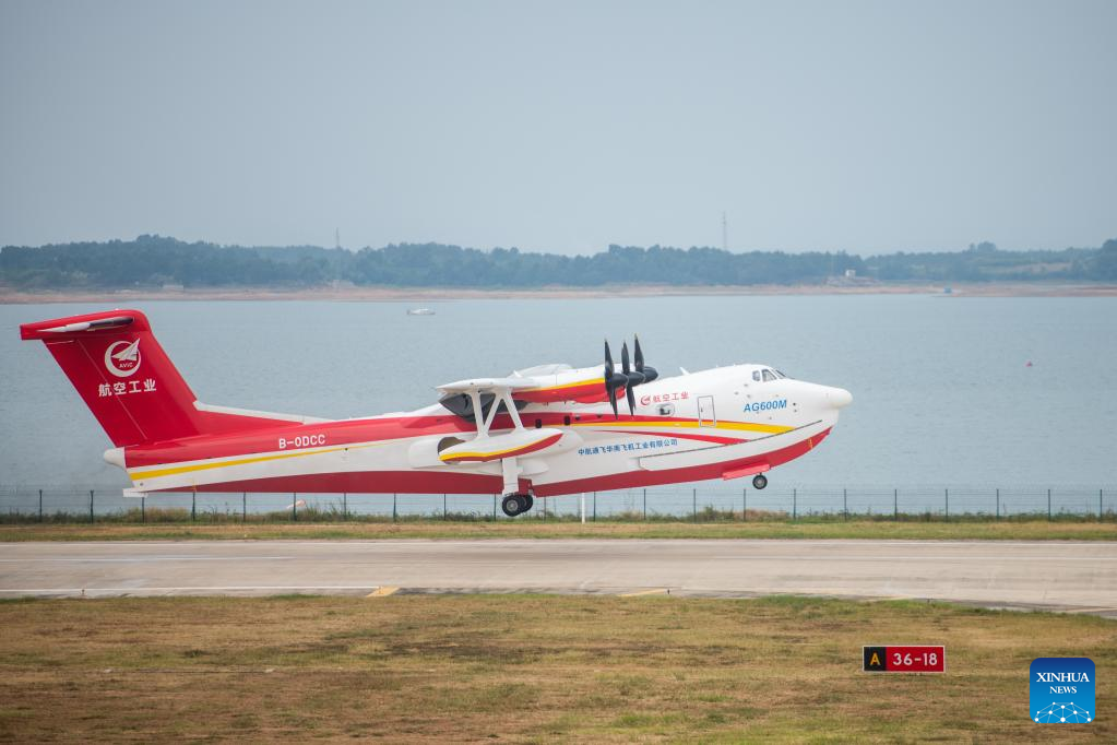 At 10:05 a.m., the AG600M aircraft carrying 12 tonnes of water took off from the ground runway at Zhanghe Airport in Jingmen, central China's Hubei Province.