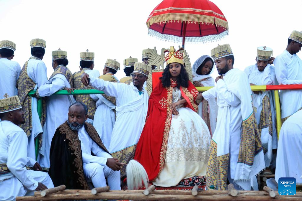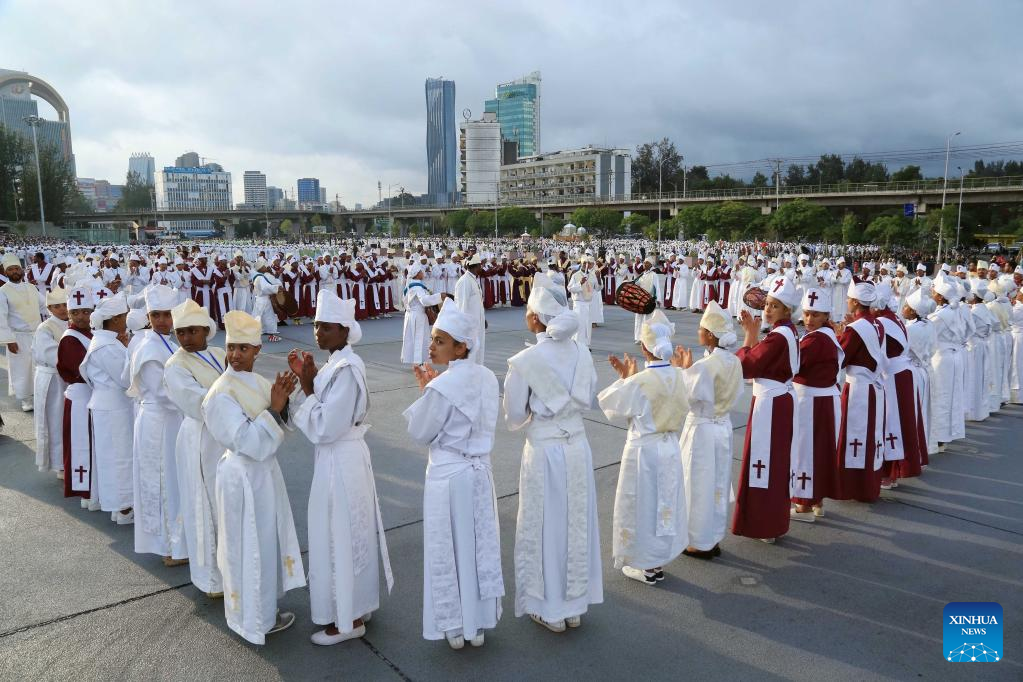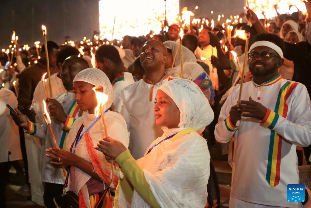 People gather in celebration of the Meskel festival in Addis Ababa, capital of Ethiopia, on Sept. 26, 2022. Ethiopian Orthodox Christians on Monday marked the Meskel festival, a religious festival celebrated among Orthodox Christians to mark the finding of the True Cross. (Str/Xinhua)