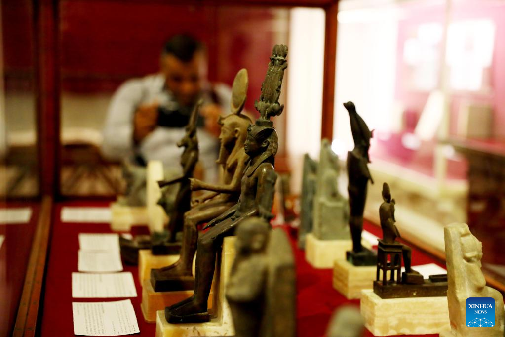 Photo taken on Sept. 27, 2022 shows ancient Egyptian artifacts on display during a temporary exhibition of antiquities at Egyptian Museum in Cairo, Egypt. The Egyptian Museum on Tuesday opened a temporary exhibition of antiquities to mark World Tourism Day, which coincides this year with the 200th anniversary of the creation of the field of Egyptology and the decoding of ancient hieroglyphs. (Xinhua/Ahmed Gomaa)