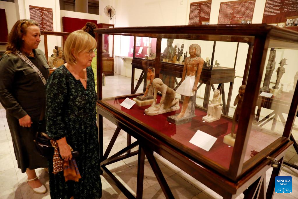 Visitors view ancient Egyptian statues during a temporary exhibition of antiquities at Egyptian Museum in Cairo, Egypt, on Sept. 27, 2022. The Egyptian Museum on Tuesday opened a temporary exhibition of antiquities to mark World Tourism Day, which coincides this year with the 200th anniversary of the creation of the field of Egyptology and the decoding of ancient hieroglyphs. (Xinhua/Ahmed Gomaa)