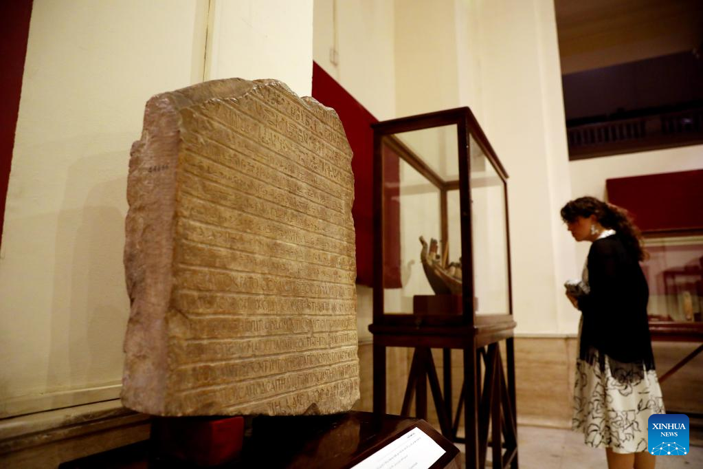 A woman views ancient Egyptian artifacts at a temporary exhibition of antiquities at Egyptian Museum in Cairo, Egypt, on Sept. 27, 2022. The Egyptian Museum on Tuesday opened a temporary exhibition of antiquities to mark World Tourism Day, which coincides this year with the 200th anniversary of the creation of the field of Egyptology and the decoding of ancient hieroglyphs. (Xinhua/Ahmed Gomaa)