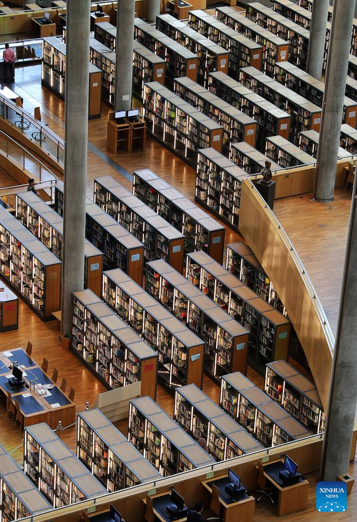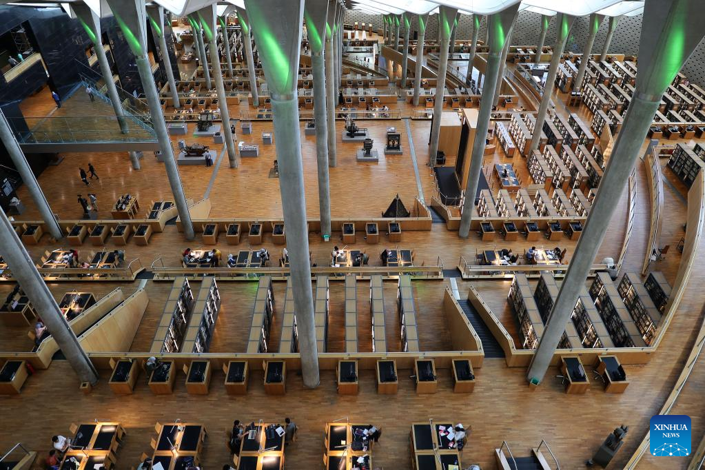 Photo taken on Sept. 27, 2022 shows a view of Bibliotheca Alexandrina in Alexandria, Egypt. Bibliotheca Alexandrina, a massive unique library and cultural symbol of the Egyptian Mediterranean coastal city of Alexandria which was founded by King Alexander the Great some 2,300 years ago, features a disc-shaped exterior and 11 internal levels, all under one glistening, tilting roof. (Xinhua/Wang Dongzhen)
