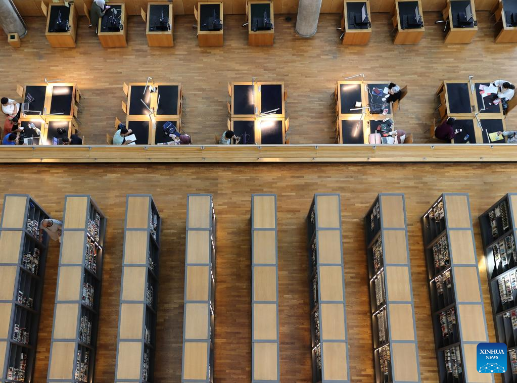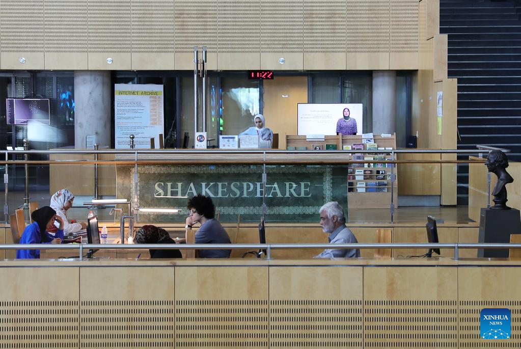 People are seen at Bibliotheca Alexandrina in Alexandria, Egypt, on Sept. 27, 2022. Bibliotheca Alexandrina, a massive unique library and cultural symbol of the Egyptian Mediterranean coastal city of Alexandria which was founded by King Alexander the Great some 2,300 years ago, features a disc-shaped exterior and 11 internal levels, all under one glistening, tilting roof. (Xinhua/Wang Dongzhen)