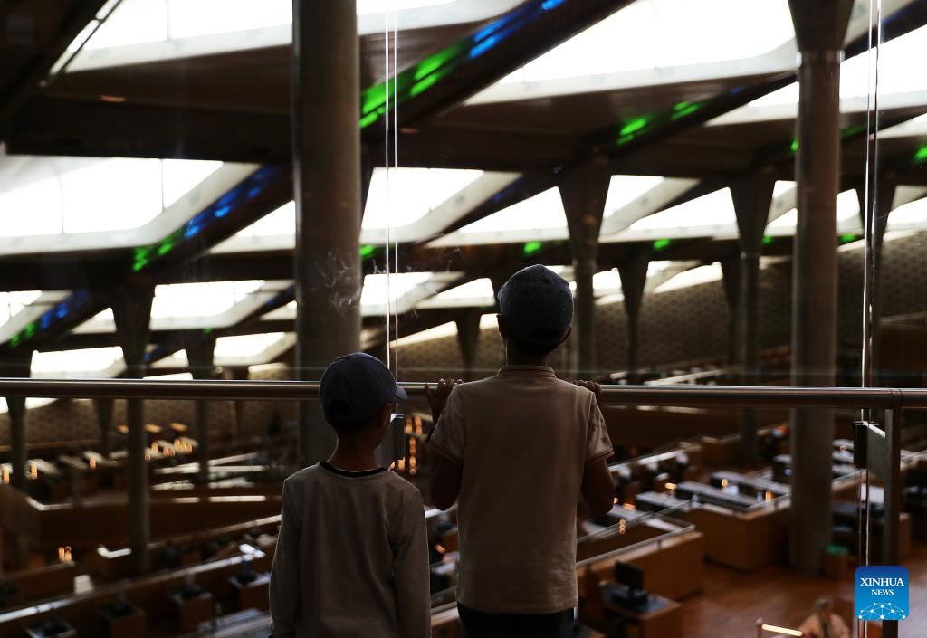 Children visit Bibliotheca Alexandrina in Alexandria, Egypt, on Sept. 27, 2022. Bibliotheca Alexandrina, a massive unique library and cultural symbol of the Egyptian Mediterranean coastal city of Alexandria which was founded by King Alexander the Great some 2,300 years ago, features a disc-shaped exterior and 11 internal levels, all under one glistening, tilting roof. (Xinhua/Wang Dongzhen)