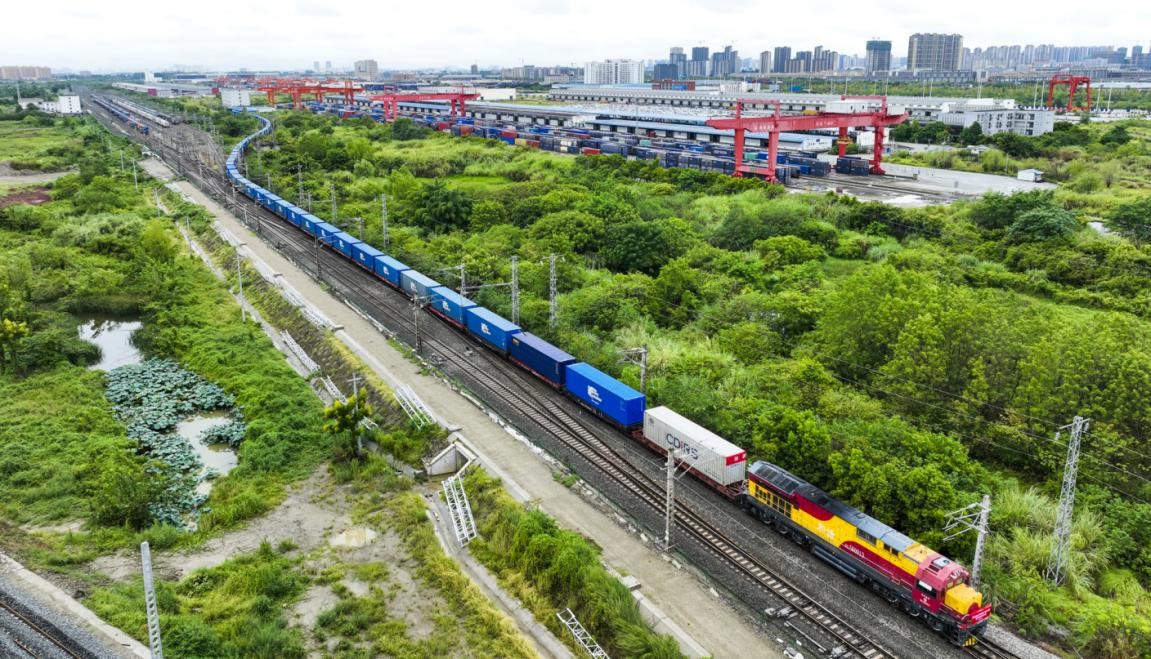 A train carrying air conditioners, televisions, refrigerators, general merchandise and other commodities with independent intellectual property rights departs from Chengdu, southwest China's Sichuan province for European destinations, including Germany and Russia, Aug. 29, 2022. (People's Daily Online/Bai Guibin)