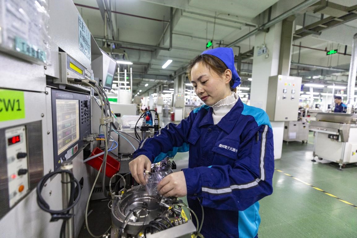 A worker produces electronic parts and components in a workshop of a company in Sihong county, east China's Jiangsu province, Dec. 5, 2020. The company, a supplier for renowned IT firms such as Huawei, Foxconn and Samsung, holds 34 unity model and invention patents. (People's Daily Online/Chen Yu)