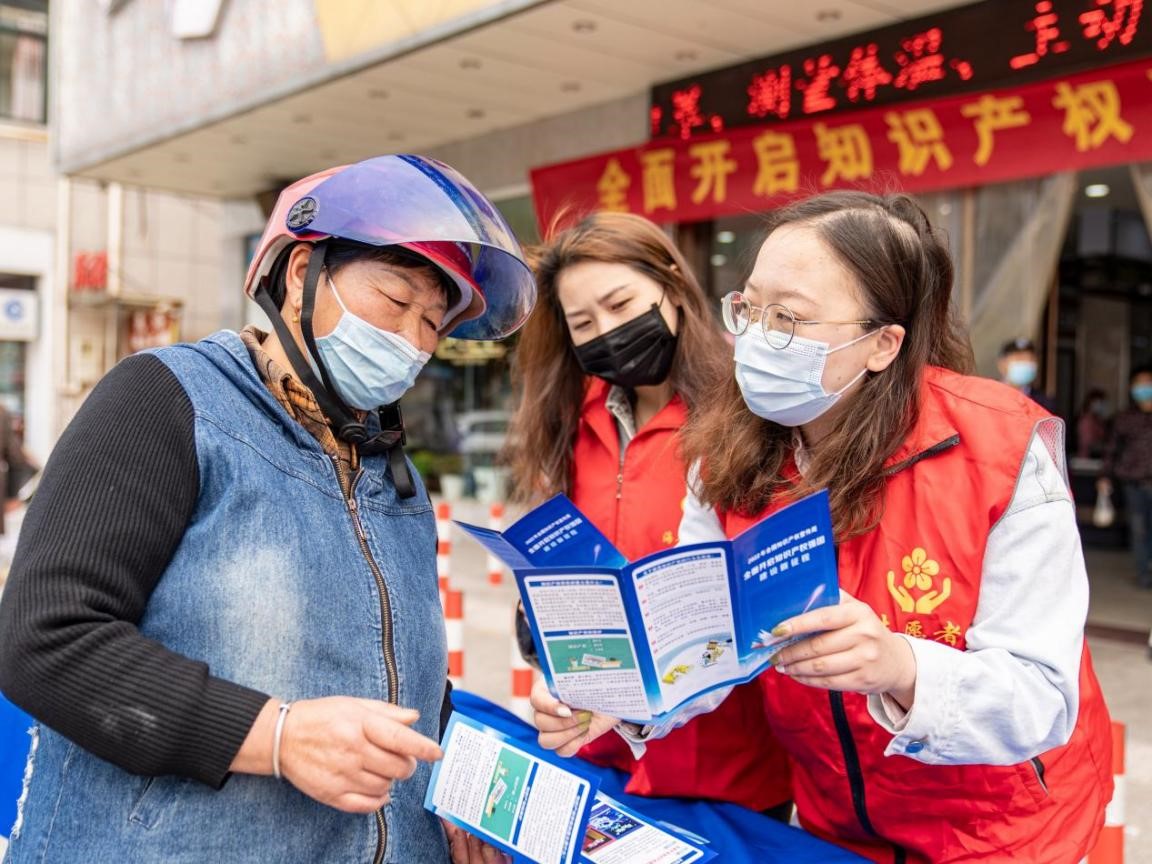 Volunteers explain intellectual property right knowledge to a senior woman in Dagong township, Hai'an, east China's Jiangsu province, April 28, 2022. (People's Daily Online/Zhai Huiyong)