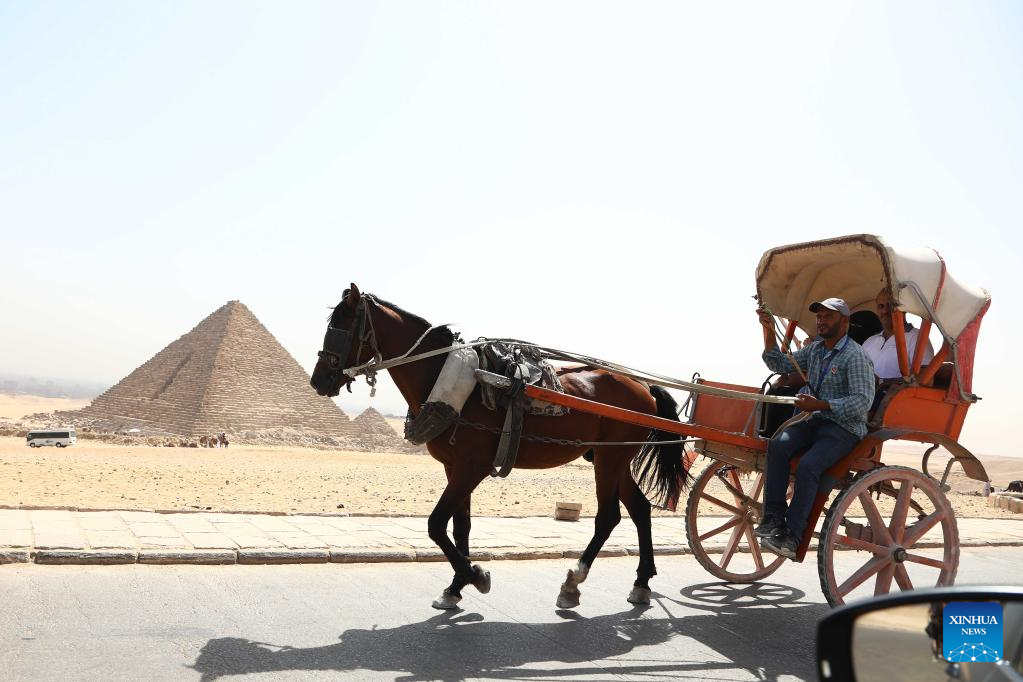 Tourists take a carriage while visiting the Giza Pyramids scenic spot during the World Tourism Day in Giza, Egypt, Sept. 27, 2022. Egypt on Tuesday opened most of its museums and archaeological sites, including the Giza Pyramids, to visitors for free on the occasion of the World Tourism Day. (Xinhua/Ahmed Gomaa)