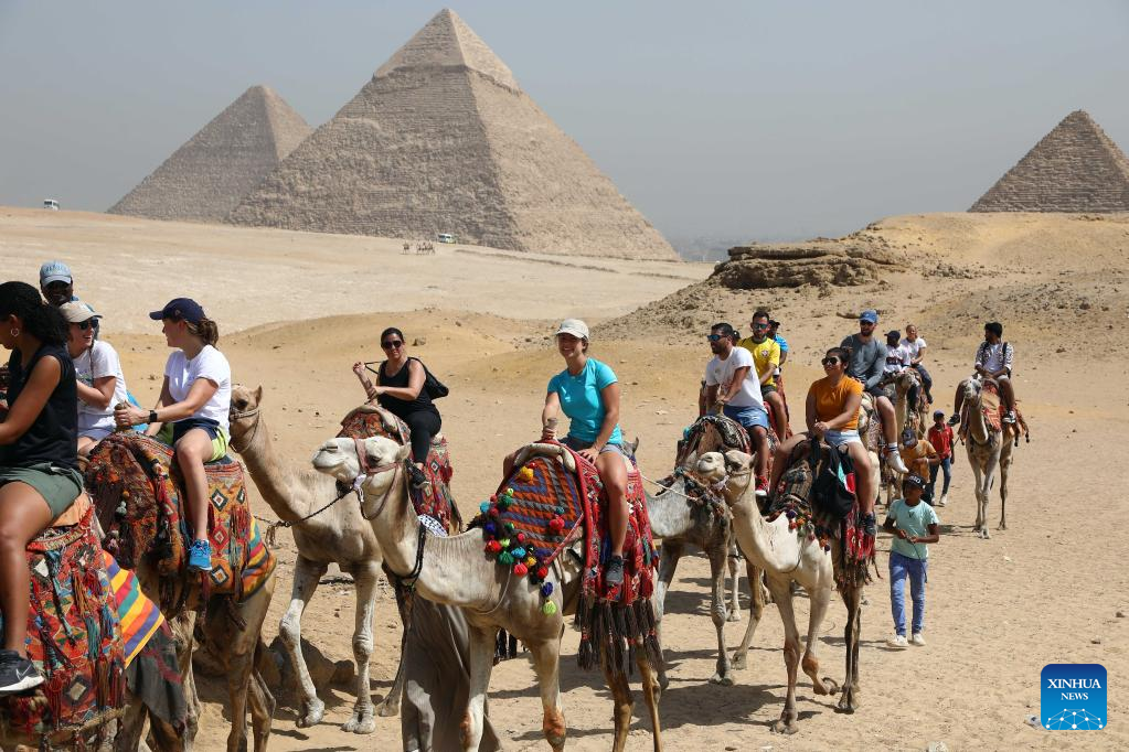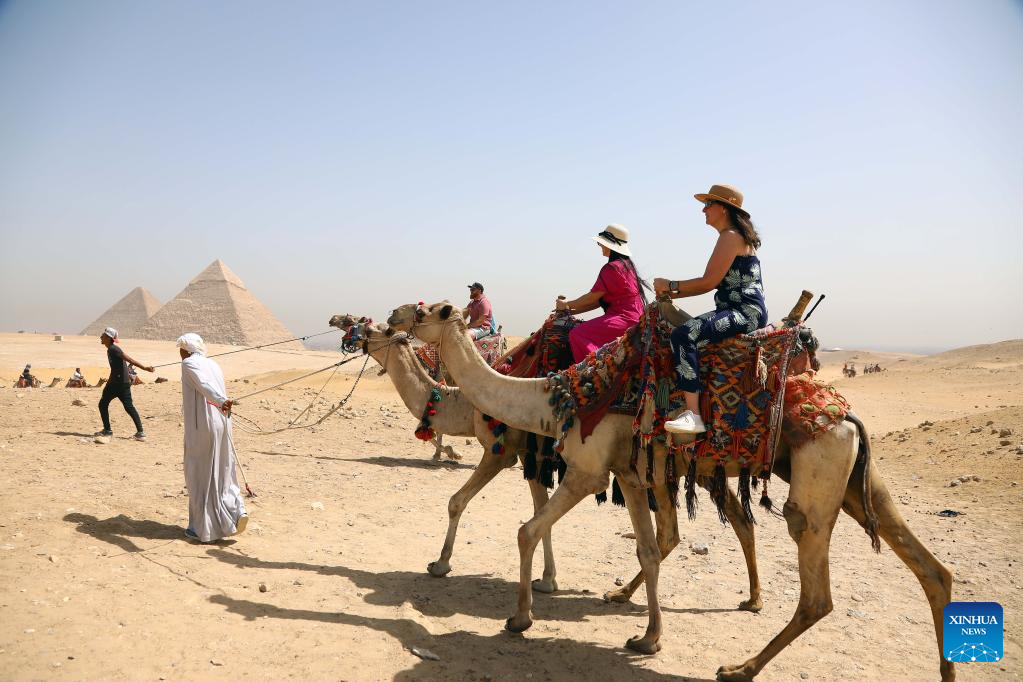 Tourists ride camels while visiting the Giza Pyramids scenic spot during the World Tourism Day in Giza, Egypt, Sept. 27, 2022. Egypt on Tuesday opened most of its museums and archaeological sites, including the Giza Pyramids, to visitors for free on the occasion of the World Tourism Day. (Xinhua/Ahmed Gomaa)