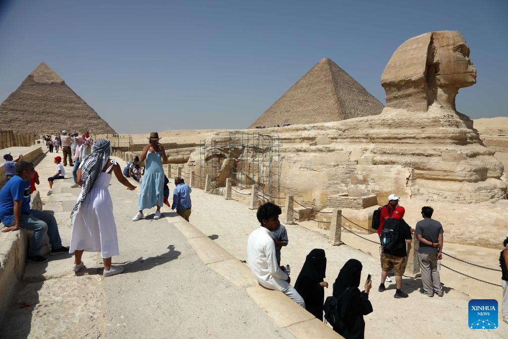 Tourists visit Sphinx at the Giza Pyramids scenic spot during the World Tourism Day in Giza, Egypt, Sept. 27, 2022. Egypt on Tuesday opened most of its museums and archaeological sites, including the Giza Pyramids, to visitors for free on the occasion of the World Tourism Day. (Xinhua/Ahmed Gomaa)