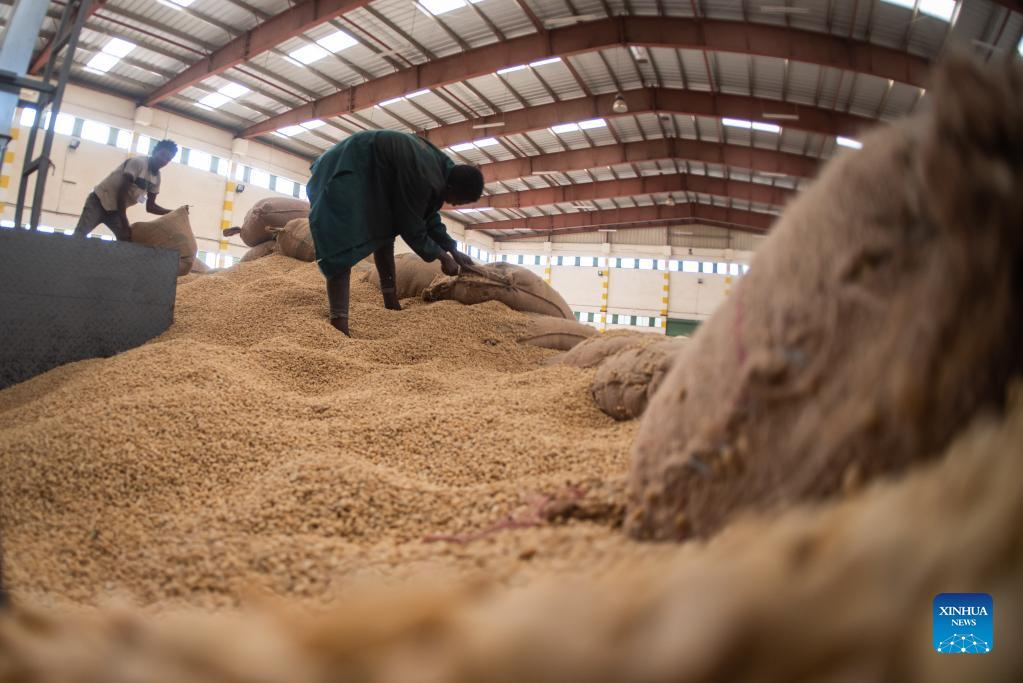 Employees work with coffee beans at a coffee processing plant in Addis Ababa, Ethiopia, Oct. 21, 2021. The increasing number of consumers and growing popularity of Ethiopia's coffee among the Chinese people is propelling Ethiopia's coffee export market, officials and coffee exporters said. (Xinhua/Michael Tewelde)