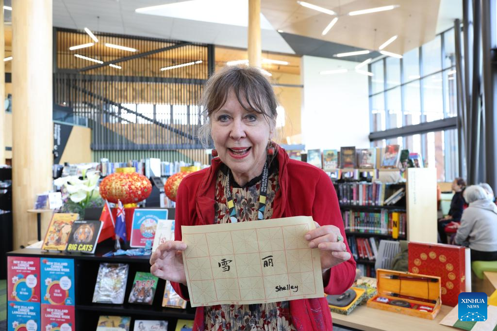 A woman displays her Chinese name in Chinese calligraphy at a community library in Wellington, New Zealand, Sept. 27, 2022. The opening reception of New Zealand Chinese Language Week 2022 was held on Monday evening at the Grand Hall of Parliament Buildings in Wellington. During this week, New Zealand will host a series of traditional Chinese cultural activities. (Photo by Meng Tao/Xinhua)