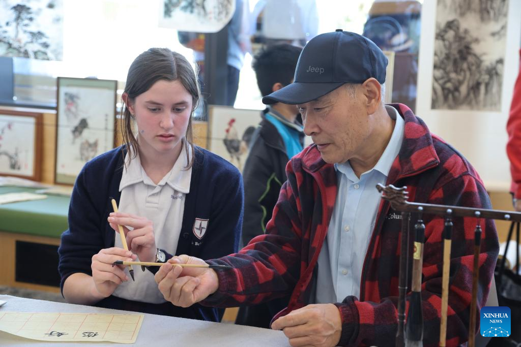A student learns Chinese calligraphy as a Chinese instructor helps at a community library in Wellington, New Zealand, Sept. 27, 2022. The opening reception of New Zealand Chinese Language Week 2022 was held on Monday evening at the Grand Hall of Parliament Buildings in Wellington. During this week, New Zealand will host a series of traditional Chinese cultural activities. (Photo by Meng Tao/Xinhua)