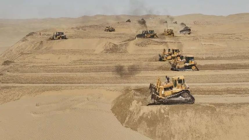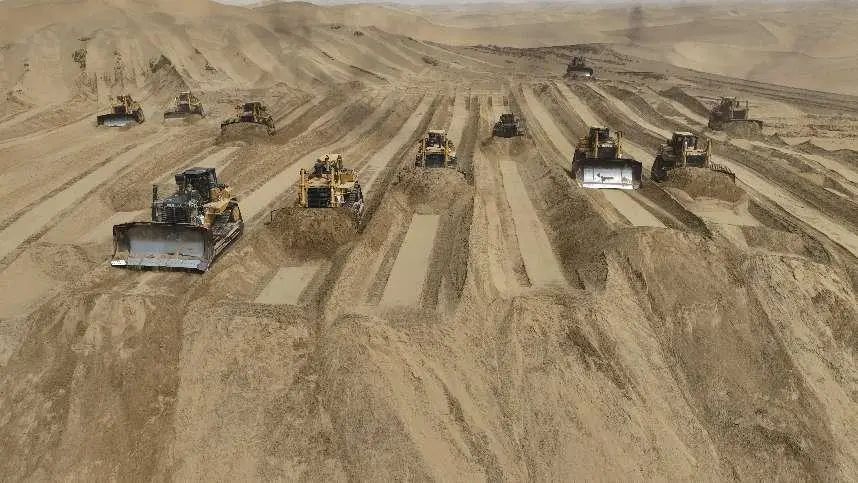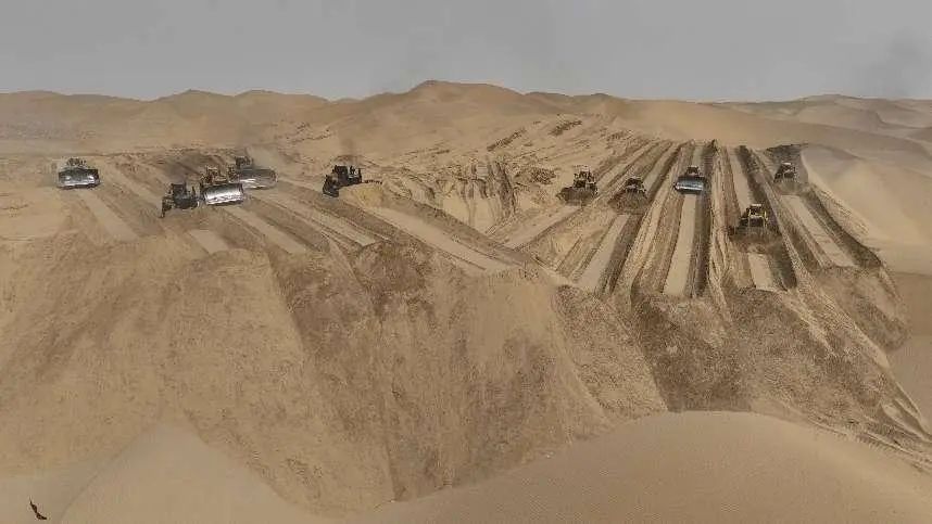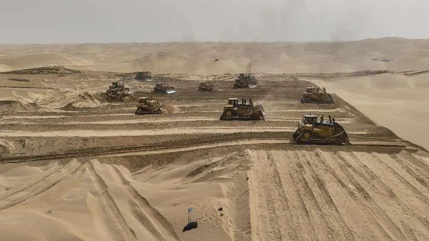 Construction of the desert highway between Tumushuke city, the 3rd Division of the Xinjiang Production and Construction Corps (XPCC), and Kunyu city, the 14th Division of the XPCC in northwest China's Xinjiang Uygur Autonomous Region, is currently underway. On September 16, construction workers were driving 18 bulldozers to work on sand dunes at the construction site in Taklimakan Desert.