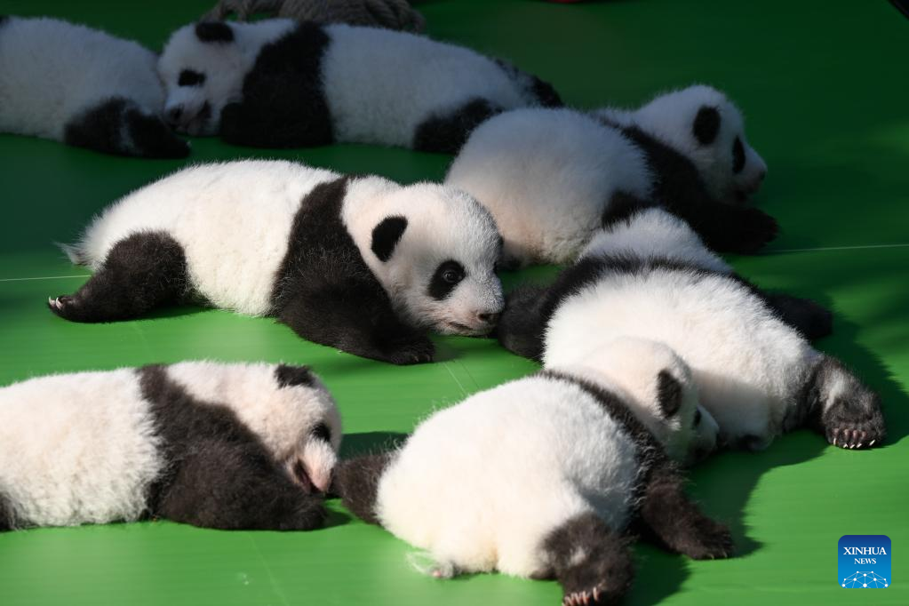 Thirteen panda cubs, all born this year, on Wednesday met the public at the breeding base in Chengdu, capital of southwest China's Sichuan Province.