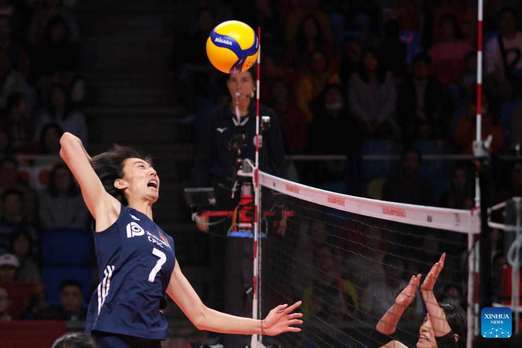 Wang Yuanyuan (L) of China spikes the ball during the Phase 1 Pool D match between China and Japan at the 2022 Volleyball Women's World Championship in Arnhem, the Netherlands, Sept. 28, 2022. (Xinhua/Meng Dingbo)