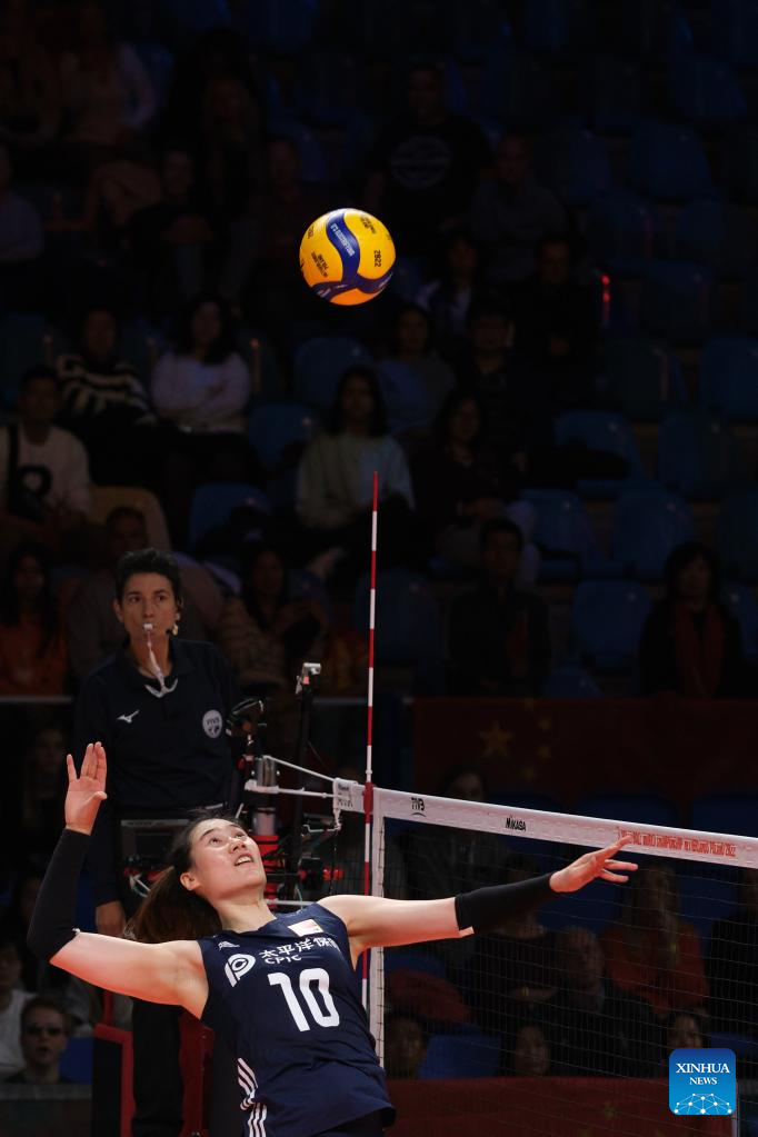 Wang Yunlu of China spikes the ball during the Phase 1 Pool D match between China and Japan at the 2022 Volleyball Women's World Championship in Arnhem, the Netherlands, Sept. 28, 2022. (Xinhua/Meng Dingbo)