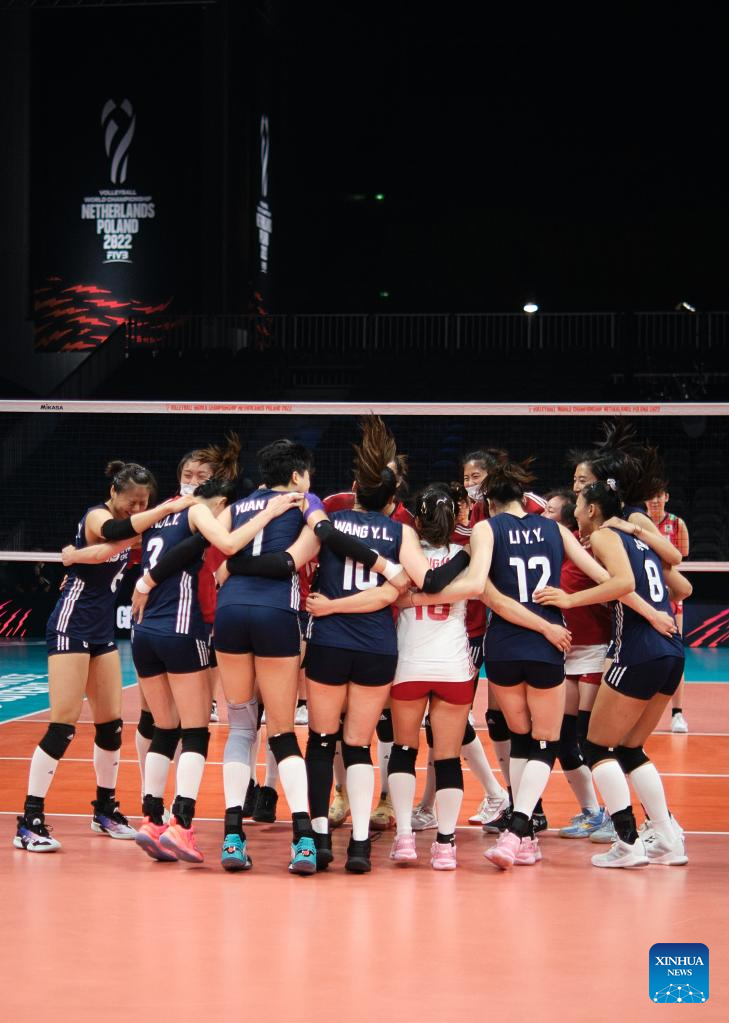 Players of China celebrate after winning the Phase 1 Pool D match between China and Japan at the 2022 Volleyball Women's World Championship in Arnhem, the Netherlands, Sept. 28, 2022. (Xinhua/Meng Dingbo)