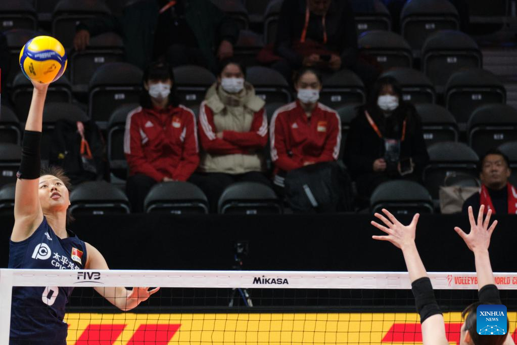 Gong Xiangyu (L) of China spikes the ball during the Phase 1 Pool D match between China and Japan at the 2022 Volleyball Women's World Championship in Arnhem, the Netherlands, Sept. 28, 2022. (Xinhua/Meng Dingbo)