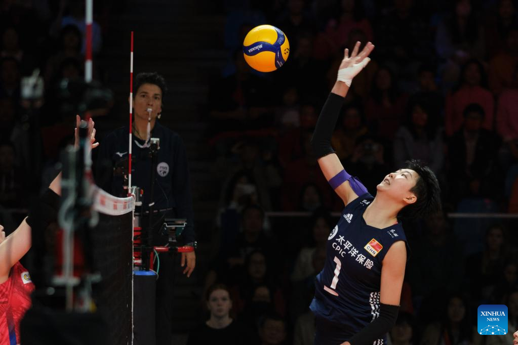 Yuan Xinyue of China spikes the ball during the Phase 1 Pool D match between China and Japan at the 2022 Volleyball Women's World Championship in Arnhem, the Netherlands, Sept. 28, 2022. (Xinhua/Meng Dingbo)