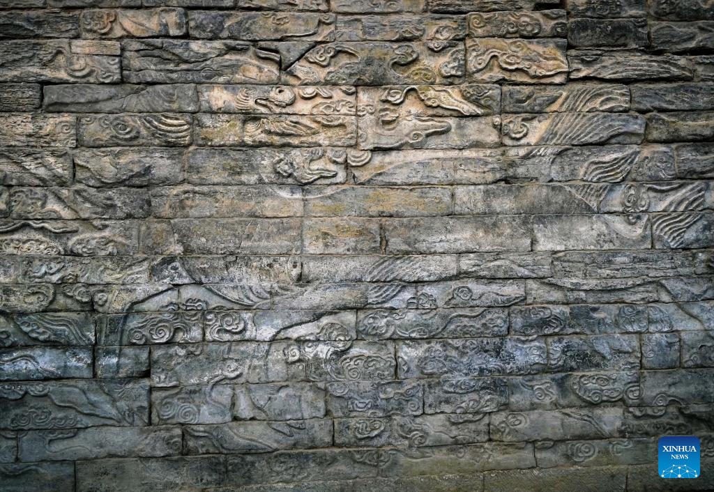 Photo taken on Sept. 21, 2022 shows part of a stone mural discovered in the Zhouqiao relics site in Kaifeng City, central China's Henan Province.