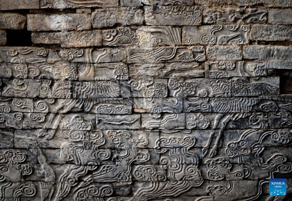 Photo taken on Sept. 21, 2022 shows part of a stone mural discovered in the Zhouqiao relics site in Kaifeng City, central China's Henan Province.