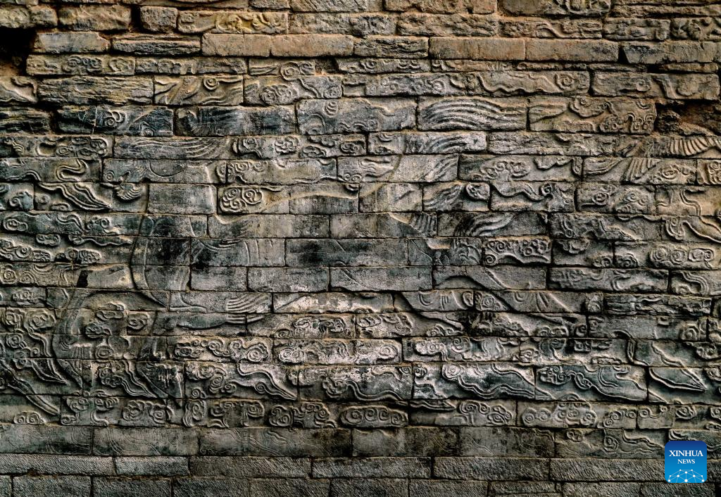 Photo taken on Sept. 21, 2022 shows auspicious patterns of traditional Chinese culture on a stone mural discovered in the Zhouqiao relics site in Kaifeng City, central China's Henan Province.(Xinhua/Li An)