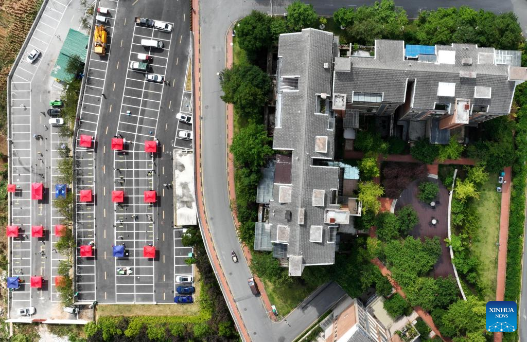 Aerial photo taken on Sept. 5, 2022 shows a community testing site for COVID-19 in Wudang District of Guiyang, southwest China's Guizhou Province. (Xinhua/Yang Ying)