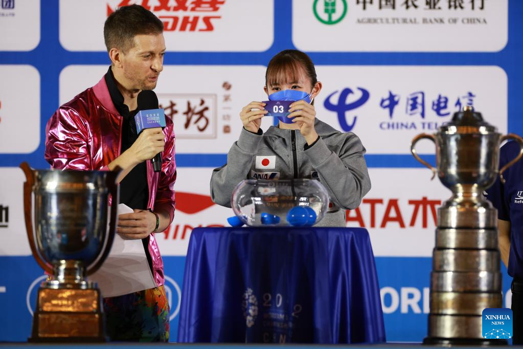Hayata Hina (R) of Japan shows a draw slip during the draw ceremony of the 2022 ITTF World Team Table Tennis Championships Finals in Chengdu, southwest China's Sichuan Province, Sept. 28, 2022. (Xinhua/Liu Xu)
