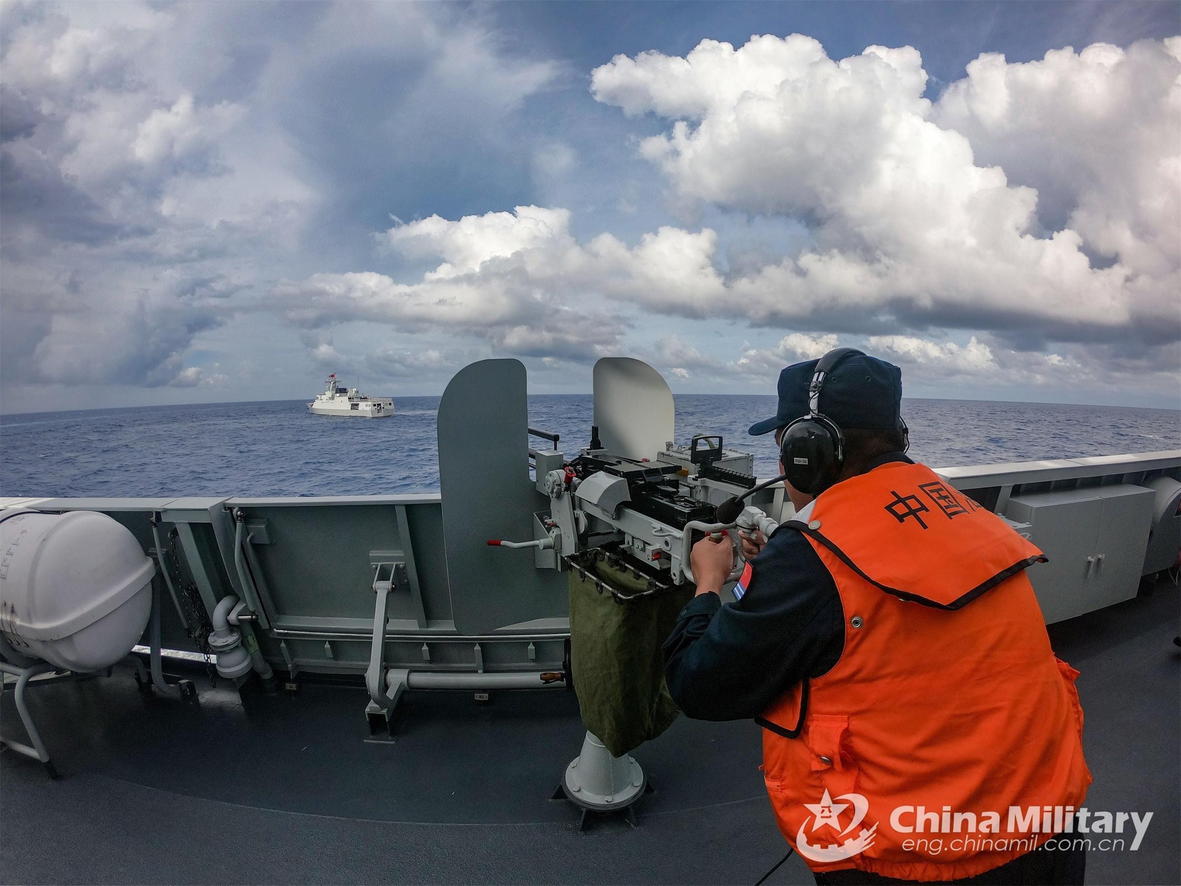 A sailor assigned to a naval frigate flotilla under the PLA Southern Theater Command holds heavy machine gun to guard against potential dangers in an all-subject training assessment on September 7, 2022. (eng.chinamil.com.cn/Photo by Zhang Bin)